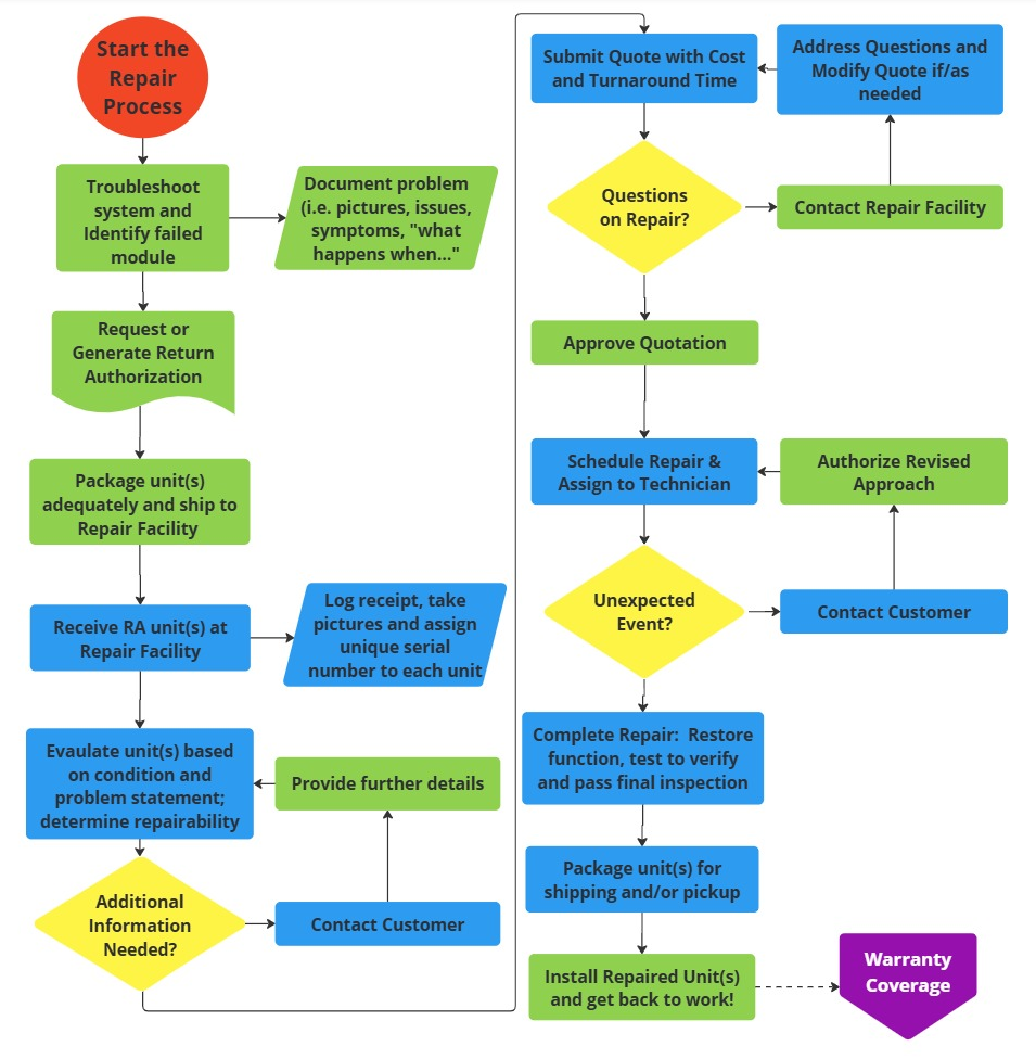 The actual repair begins with scheduling and assigning the unit(s) to a qualified technician, based on expertise and workload capacity. Using documented repair techniques and high-quality components, the technician works to restore full functionality. If something unexpected is found during the repair (unique, non-stocked components need to be sourced; an atypical anomaly is detected), either customer service or a member of the technical team will contact you to determine next steps. Once complete, the unit is tested to verify proper operation and then goes through final inspection to ensure quality standards are met.